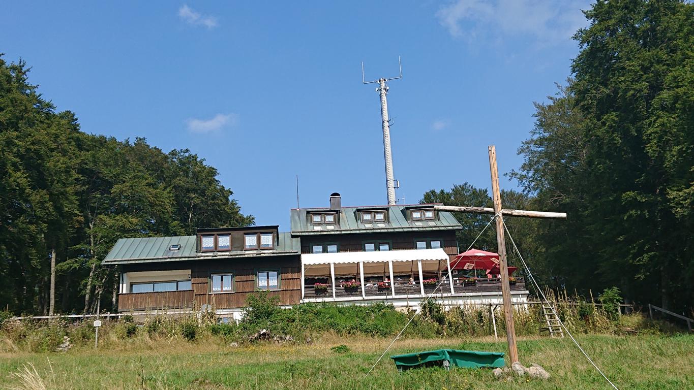 Über die “Gemündener Hütte” gelangen wir zum Sendemast am Kreuzberggipfel.