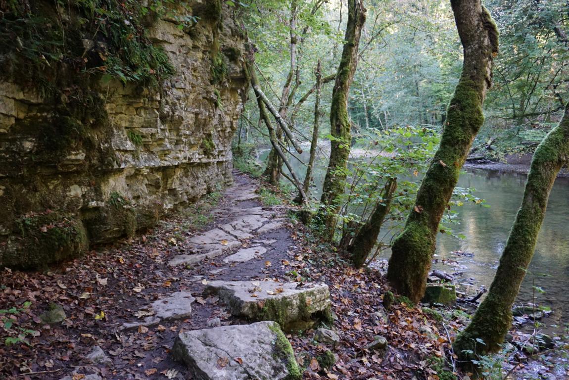 Teilweise führt der Weg durch kleine Wäldchen. Plötzlich führt er unerwartet bei der nächsten Biegung wieder auf schmalen Pfaden weiter oder überquert auf Holzbrücken die Wutach oder verläuft am gesicherten Abgrund entlang.
