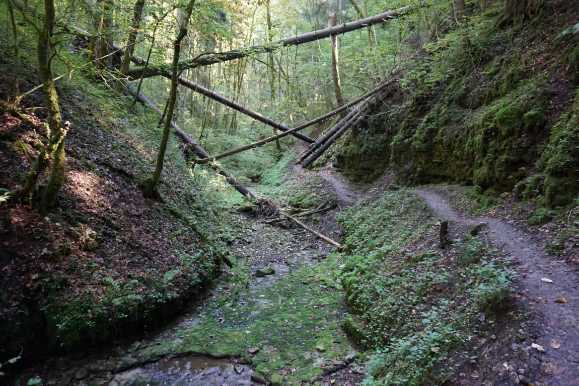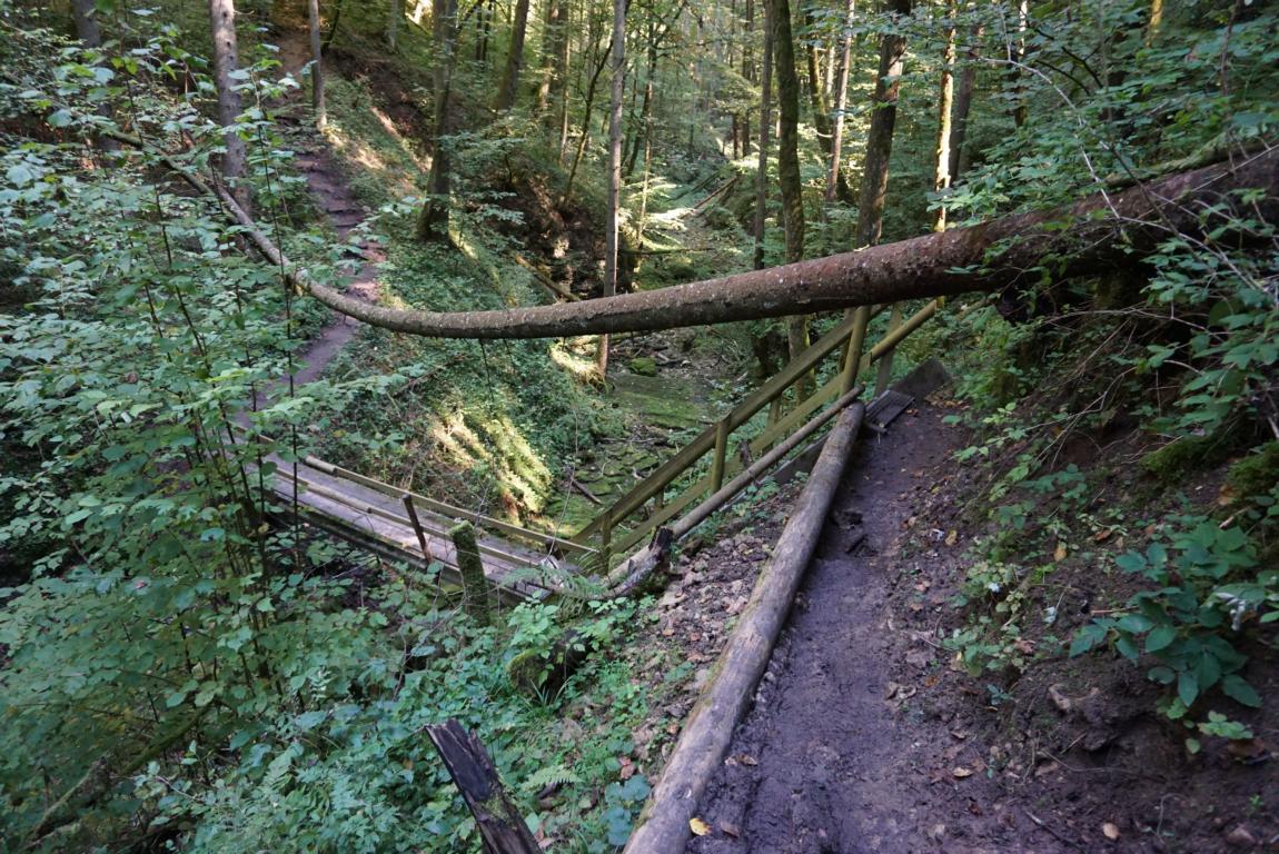 Die Schlucht wird immer enger und führt uns unter und über umgestürzte Bäume. Über Klettersteige und auf schmalen und rutschigen Pfaden geht es immer tiefer in die Engeschlucht hinein. Meist sind die Wege sehr nass und rutschig, daher ist auf den schmalen Wegen Vorsicht geboten. Bei Regen ist die Engeschlucht zu meiden.
